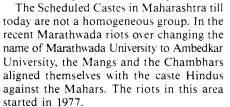 if it had been only a caste war then the Mangs, Chamars and the other castes lower than the Mahars, and therefore infinitely more despicable to the upper castes, should have been affected, their persons threatened and their proper destroyed. On the contrary, this did not happen.[8]