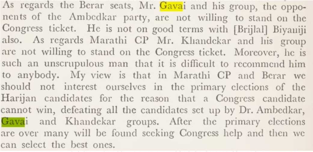 Ganesh Akkaji Gawai was a powerful Dalit leader from Maharashtra who ensured the defeat of Scheduled Caste Federation from Berar with Mr. Khandekar as the Congress could not win in Berar. This was the opinion of Sardar Patel[28].