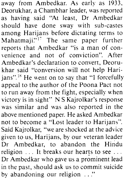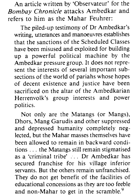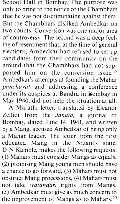 In the above image, you can read that the Mang and Chambhars never accepted that Dr. Ambedkar was the leader of all Dalit communities and only saw him as a Mahar leader as they believed his activism was focused only on getting his own “caste-fellows” upward mobility. Other instances will follow.