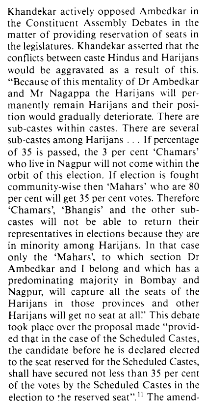 H.J. Khandekar, a ‘Harijan’ leader and veteran, criticized Dr. Ambedkar for the actions taken by him and Dr. Nagappa. Khandekar believed that these actions would escalate the conflicts between the caste Hindus and Dalits. He also expressed concern about how the reservation of seats favored the Mahars, who were the largest population group among the depressed classes. This would ultimately disenfranchise the Chambhars, Mangs, and other smaller caste groups within the Dalits. It is noteworthy that H.J. Khandekar himself belongs to the Mahar community.