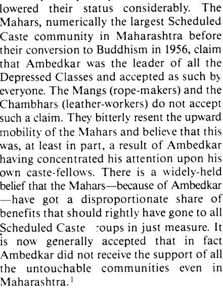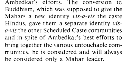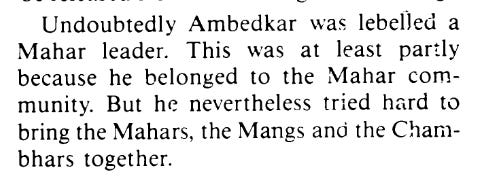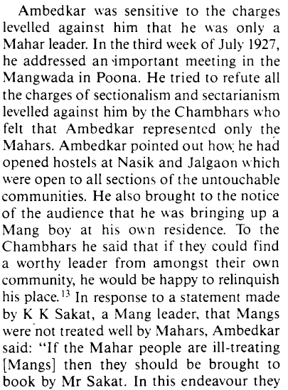Here Dr. Ambedkar even after trying to convince the Mangs and Chambhars that he was for all of them having equal rights was always seen as a Mahar leader, even though he encouraged inter-dining and even opened hotels for all of them for them to eat and live and how his political party the Independent Labor Party was open to all depressed classes. Other instances of this are present in the article. He was accused by veteran congress Dalit leader N.S. Kajolkar of using funds for only the Mahars instead of all Dalit caste groups.
