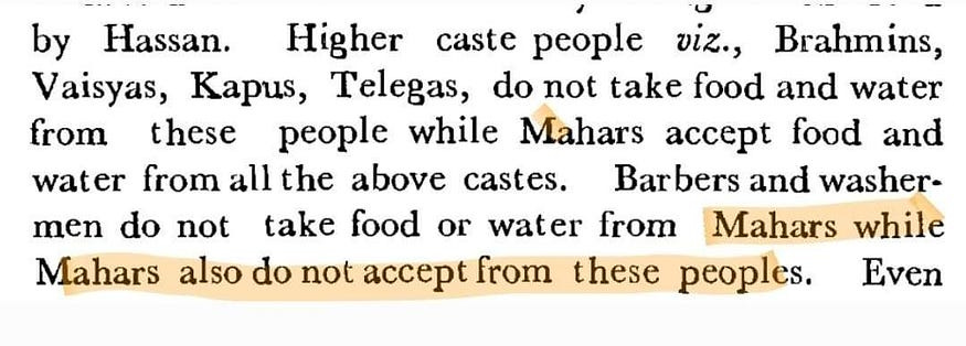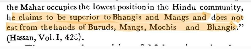 Here an appeal was submitted by the Mahar community to the government for maintaining certain privileges of theirs which were conferred upon them by ‘society’ on the basis of their caste. These privileges included the offering which was provided on the occasion of ‘pola’ which was taken by the Mahars was now being asked by the Mangs and they wanted to stop this. The offering of the peda which was provided on the occasion of Santi was now being demanded by the Mangs as well and they did not want the Mangs to ask for it. They also did not want the Mang to ride on horses for their wedding as the Mahars used to do so and wanted them instead to ride on buffaloes. I do not share these to say that caste atrocities done on LCs by UCs are justified, but to disprove the claim that the SCs are a homogeneous and natural group as they also committed caste based discrimination on one another. Other examples of the attitudes of Mahars on other communtiies are also provided below: